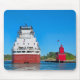 Un gran carguero atraviesa el agua cerca de un faro rojo brillante de Michigan bajo un cielo azul claro