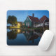 Mousepad de fotos con una casa tradicional de madera usada como una granja de quesos con pintura verde con tejas rojas y reflejo en el agua al inicio de la noche al crepúsculo en el museo Zaanse Schans en Holanda.