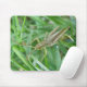 Esta brillante tabique cuenta con una detallada foto macro de un pequeño saltamontes verde con marcas marrón estampadas sentadas en el césped. En la fotografía se puede ver el detalle de las patas unidas, antenas largas y ojos negros y dorados del saltamontes.