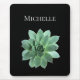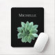Green succulent mouse pad, with a desert botanical image set on a black background. With white customizable lettering, you can personalize with your own name. Great for adding a botanical touch to your home office.