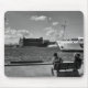 Dos jóvenes sentados en una banca viendo un barco de transbordador que partía del muelle público de transbordadores de Kadikoy, en el lado asiático de Estambul. El Bósforo y la estación histórica de tren están en las vistas. Guay, fotografía urbana en blanco y negro de estilo de vida y cultura de la ciudad