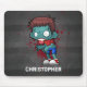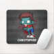 Una almohadilla de ratón con un tipo zombi de aspecto fresco, con ropa rasgada y rasgada con los brazos extendidos buscando cerebros. Una bandeja de pintura que parece una mancha de sangre en el fondo detrás del zombi. Se coloca sobre un fondo de color negro grunge de carbón vegetal con rayas descoloridas. Personaliza con un nombre.