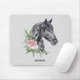 Una almohadilla de ratón con un hermoso ilustracion de cabeza de caballo negra con un lujoso adorno floral junto a su cuello. Elegante y elegante pintura de animales.