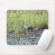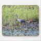 Fotografía de una Gran Garza Azul cruzando un estanque. El estanque está cubierto de nenúfares. El estanque está bordeado de plantas de tallo verde. Derechos reservados ©2021 Kimberly J Tilley.