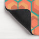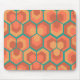 Esta almohadilla del ratón tiene un diseño geométrico de hexágonos en conjuntos de tres que parecen flores en oro, naranja y rojo en un campo de verde azulado.