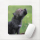 Fotografía de un adorable cachorro de lobo negro aullando en el pasto.