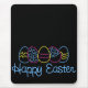El diseño se compone de huevos decorados con neones de color rosa, amarillo, violeta y azul. Happy Easter está impreso en la parte inferior de este diseño. Se aplica un fondo negro a la parte posterior. Este diseño se presenta en diversos planos y en dos estilos de almohadillas de ratón. Puede personalizar este elemento a su gusto.