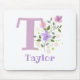 El diseño incluye monograma y nombre con flores a ambos lados en estilo acuarela pastel. El nombre del ejemplo es Taylor. Podría ser para cualquier persona con un nombre que comience con T.