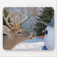 Pato blanco buscando la nariz de zanahoria de un muñeco de nieve.