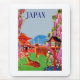 Poster de viajes vintage para Japón mostrando ciervos y una pagoda en el fondo.
