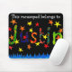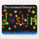 Un tabique de buena calidad con un diseño colorido de papel pintado a mano que dice 'Este tabique pertenece a Justin' sobre un fondo negro. Vea también la tarjeta de felicitación y los regalos.