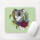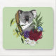 Un oso de koala lindo en una extremidad de árbol con flores y hojas de eucalipto en el fondo de verde