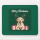 "This beautiful illustration features a detailed portrait of a loving Yellow Labrador Retriever with its characteristic broad head, gentle expression, and smooth golden coat. The dog is given a charming holiday touch with reindeer antlers adorned with small golden and green/blue ornaments. Two beautifully wrapped Christmas presents with red ribbons sit prominently on either side. This high-quality graphic is ideal for personalized holiday gifts for Lab owners, Christmas cards, apparel, ornaments, or any product celebrating this friendly and devoted dog breed."