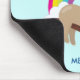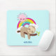 Una almohadilla de ratón con un ilustracion con una graciosa pereza marrón flotando alegremente en una rama de árbol. Un arcoíris colorido detrás de él junto con un sol rosado sobrevolando la cabeza. Agradable, adorable y de moda.