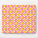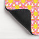 Esta almohadilla del ratón tiene un diseño geométrico de triángulos rosados y naranjas repetidos con círculos amarillos sobre un campo de blanco roto. ¿Quieres el mismo diseño en colores diferentes? Mándame un mensaje.
