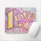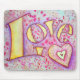 Pintura acuarela de la palabra amarilla dorada "Amor" con doble corazón. El rosa y el morado resaltan las letras y el corazón. Una ligera pizca de purpurina en la parte superior le da al cuadro un resplandor brillante.
