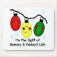 Tres bombillas de árbol de Navidad con ojos y una sonrisa en rojo, verde y amarillo y un texto que dice "¡Soy la luz de la vida de mamá y papá" en bolsas de té de vacaciones, camisetas y otros artículos para niños!