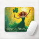 Una mujer alegre de cabello rojo con un elegante vestido verde baila llena de alegría de vivir delante de un fondo amarillo dorado y brillante. Está sosteniendo un gran trébol de cuatro hojas en la mano, mientras que pequeños tréboles flotan en el aire a su alrededor. La escena irradia energía, felicidad y celebración, acorde con el Día de San Patricio.