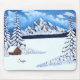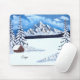 Un protector de ratón con una hermosa escena invernal que incluye montañas nevadas, cabaña rústica y pinos cubiertos de nieve. La imagen y el texto pueden ser personalizados. Obra original de W.B.