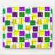 Esta almohadilla del ratón tiene un diseño geométrico de cuadrados en color púrpura, amarillo y verde dispersos alrededor con sus contornos.