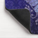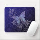 Diseño elegante y elegante de la mariposa: floral como remolinos, y una mariposa con seda-como las alas en las sombras de azul y de la lila, adornadas con las joyas brillantes, sistema en un fondo del damasco azul marino.