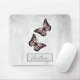 Añada un toque elegante al espacio de trabajo de su computadora con una almohadilla de ratón personalizada y brillante de mariposas rosadas. El diseño de la almohadilla del ratón presenta mariposas brillantes que descansan sobre una vina floral blanca sobre un fondo gris. También hay artículos adicionales disponibles con este diseño.