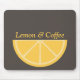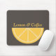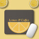 Una almohadilla de ratón marrón con una semisección de limón amarillo y texto de personalizable. Se podría usar en casa o en la oficina. ¡También puedes hacer un regalo de cumpleaños fresco a tu mejor amigo!