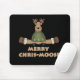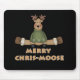 Un alce con botas de senderismo y un suéter verde y texto que dice "Feliz Chris-Moose" se muestra en estas adorables tarjetas de felicitación de vacaciones temáticas de alce, botones, imanes, bolsas de té, camisetas y más.