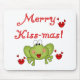 Una linda rana verde con grandes labios de kissable rojo y texto rojo que dice "¡Feliz Beso!" en tarjetas de felicitación de vacaciones, bolsas de té, camisetas, tazas y más.