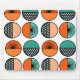 Esta almohadilla de ratón tiene un diseño moderno de mitad de siglo de círculos verde azulados y naranjas con medio estallido en algunos y pequeños círculos repetitivos en otros.