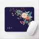 Un pulverizador colorido de flores botánicas gráficas decora este mousepad y se puede personalizar con tres iniciales de monograma. El fondo es un azul marino rico.