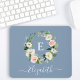 Alfombrilla de ratón de corona de flores rosas de acuarela elegante moderna incluye rosas rosadas, flores blancas y vegetación botánica hermosa. Fondo azul polvoriento. Personalizado con la inicial de tu monograma y nombre en una escritura elegante.