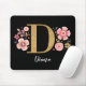 Una hermosa almohadilla de ratón floral rosa monogramada, femenina, con flores rosadas y una letra de monograma D de oro falso sobre un fondo negro. Personalice el teclado del ratón agregando su nombre debajo del monograma. Hace un regalo divertido para un amigo o para una dama de honor. Diseñado para ti por Blackberry Boulevard.