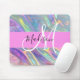 Nombre del monograma holográfico iridiscente del arco iris giratorio y almohadilla inicial del ratón. Su nombre personalizado y su monograma están escritos en un guión elegante con letras a mano con un fondo rosado. ¡Un regalo perfecto de cumpleaños o Navidades!