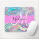 Nombre del monograma holográfico iridiscente del arco iris giratorio y almohadilla inicial del ratón. Su nombre personalizado y su monograma están escritos en un guión elegante con letras a mano con un fondo rosado. ¡Un regalo perfecto de cumpleaños o Navidades!