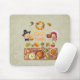 Mousepad con un ilustracion de Acción de Gracias - peregrino y nativo con muchos dibujos temáticos de acción de gracias. Una mesa con un glorioso festín de pavo, hojas de otoño y una corona. El texto dice Muchas gracias. Se coloca sobre un fondo bronceado con un patrón de damasco.