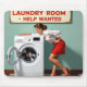 Una mujer vestida con un atuendo retro se inclina sobre un secador de ropa blanco, con un cartel que dice "Se busca ayuda en la lavandería" encima de ella