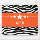 Moderno y moderno Sassy Star Zebra Mousepad con un fondo de moda de cebra en blanco y negro y un atrevido borde naranja adornado con un divertido motivo estrella. Este diseño ondulado puede ser personalizado con el texto personalizado de su elección. Haga clic en "Personalizar" para encontrar más opciones de personalización.