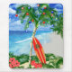 Buenas fiestas de las playas arenosas calientes de su playa tropical preferida de la isla. Palmera adornada con los ornamentos y las luces del navidad, con una tabla hawaiana retra inclinándose contra el árbol de navidad.