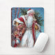 Un cojín de ratón encantador del navidad del vintage que ofrecía navidad del padre en su manera a través de la nieve cargó con juguetes y un árbol de abeto.