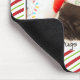 ¡Una almohadilla de ratón para la temporada festiva! Ilustrado con una adorable foto de un cachorro durmiendo mientras llevaba un sombrero de santa. Feliz Navidad está escrito en la banda de su gorra, con una moderna letra escrita a mano. Un borde oscuro con luces de Navidades coloridas rodea el marco de esta bonita foto. El fondo es un patrón festivo rayado de caña de caramelo en blanco y verde rojo. El texto dice Pugs & Kisses y se puede cambiar/personalizar para adaptarlo a tus necesidades.
