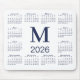 Minimal calendar mouse pad features a navy blue 2026 calendar on a white background with a bold, dark blue custom monogram above the year in the middle. Add your initial in the sidebar.