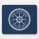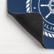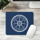 Mousepad con un elegante y blanco emblema de la rueda y la cuerda del barco con el nombre del barco personalizado y el puerto de caldeo (u otro texto personalizado) sobre un fondo azul oscuro.