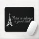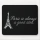 El diseño blanco y negro ilustrado por la torre Eiffel famosa y escrito en la fuente elegante manuscrita "París es siempre una buena idea".
