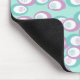 Esta almohadilla del ratón tiene un patrón de óvalos dispersos en turquesa y púrpura con óvalos blancos y círculos con líneas dentro.