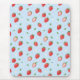 Patrón lúdico lleno de fresas pintadas a mano, pequeñas flores blancas y hojas verdes sobre un fondo azul claro pastel. Ideal para los productos de primavera o para las impresiones de tejidos lindos.
