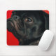 Fotografía fotográfica de un perro de cerdo negro de fondo rojo