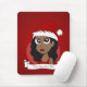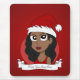 con un ilustracion de hermosa joven afroamericana con cabello ondulado y el gorra de Santa Claus; con plantilla de texto editable, diseño de vacaciones Navidades en un fondo rojo, por Radka Kavalcova