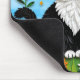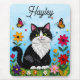 A sweet personalized mouse pad with a cute illustration of a black and white cat surrounded by flowers and butterflies in a paper quilling impasto style.