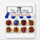 Apple, blueberry, cherry, peach, pecan, pumpkin, strawberry, and sweet potato "pi"s in a bakery window.